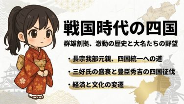 戦国時代の四国勢力図を徹底解説。長宗我部元親の四国統一過程(1560-1585年)、三好長慶・十河一存の阿波・讃岐支配、土佐七雄から豊臣秀吉の四国征伐まで、地図・年表・インフォグラフィックでわかりやすく図解。2025年最新版。